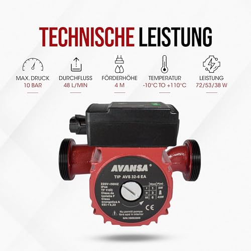 AVANSA AUTO 32- 6/ 180 E Elektronische Umwälzpumpe 230V- Hocheffizienz Heizungspumpe DN32 2 Zoll- Energiesparende Zirkulationspumpe 180mm Klasse A