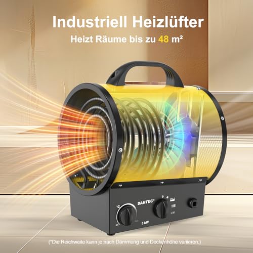 DAHTEC Tragbar Heizlüfter Klein 5000 Watt Bauheizer Bautrockner Elektro Heizstrahler mit Thermostat Heizgebläse mit Tragbarer Griff für Innen- Außeneinsatz