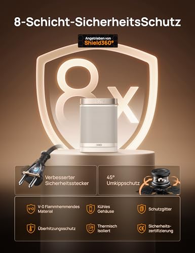 Der Dreo Heizlüfter bietet kompakte Wärmeleistung für kleine Räume und Arbeitsbereiche. Mit 1500 W PTC-Keramiktechnologie sorgt er in Sekunden für angenehme Wärme, ideal für Schreibtisch, Nachttisch oder Arbeitsplatte. Das Gerät ist dank DC-Motor und neun Lüfterflügeln effizienter als herkömmliche Heizlüfter und verfügt über einen elektronischen Thermostat von 3 bis 35 °C sowie ein LED-Display zur präzisen Temperaturregelung. Die 70°-Oszillation sorgt für eine gleichmäßige Verteilung der Wärme im Raum; ein integriertes Trackball-System arbeitet nahezu geräuschlos (ca. 40 dB). Für ungestörten Schlaf lässt sich ein Timer von 1 bis 12 Stunden nutzen und die Display-Abschaltung aktiviert sich automatisch. Sicherheitsmerkmale wie Überhitzungsschutz, Kippschutz, ein flammhemmendes ABS-Gehäuse, verstärkte Stecker und ein verbessertes Gummikabel gewährleisten sorgenfreie Nutzung. Der wartungsfreundliche Filter ist abnehmbar und kann gewaschen werden. Zusätzlich bietet der ECO-Modus vier Heizmodi (High, Low, ECO, Ventilator): Die Leistung passt sich automatisch der Raumtemperatur an, reduziert den Energieverbrauch und hält konstant warm.