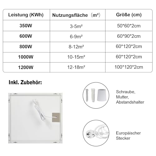 Die FrauSonne Infrarotheizung Wandmontage 800W bietet effizientes, energiesparendes Heizen direkt dort, wo Wärme benötigt wird. Die Graphen-Heiztechnologie sorgt für eine schnelle Betriebstemperatur in wenigen Minuten und reduziert den Stromverbrauch im Vergleich zu herkömmlichen Heizungen. Dank direkter Strahlungswärme bleiben Luftfeuchtigkeit und Raumkomfort erhalten, ideal für Schlafzimmer, Bad, Büro oder kleine Arbeitsräume. Die Wandmontage spart Platz und eignet sich für isolierte Wandflächen wie Fliesen oder Naturstein. Die Ausstattung umfasst eine sichere Montage inklusive Schrauben, ein 1,92 m langes Sicherheitskabel, einen quadratischen Aluminiumrahmen sowie ein feuerfestes Gipskarton-Rückteil. Für maximale Sicherheit sorgt der TÜV-zertifizierte Überhitzungsschutz, der die Wärmequelle automatisch bei 115–120 °C abschaltet. Die 10 Jahre Herstellergarantie unterstreicht die Zuverlässigkeit dieser Infrarotheizung als energiesparende Elektroheizung.