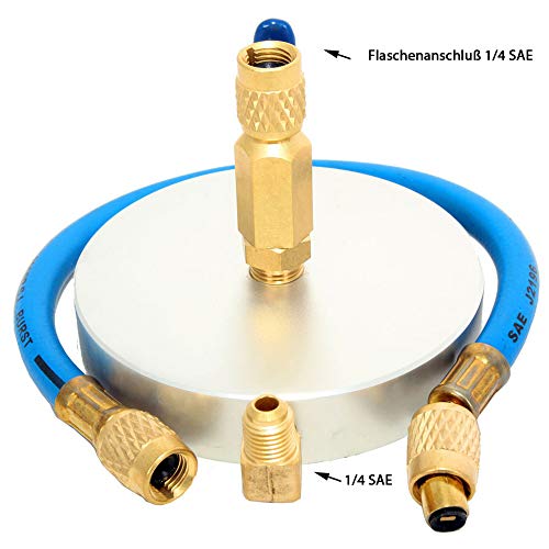 Füllset mit Standfuß und Absperrventil für 1–2 kg Kältemittelflaschen R407c. In Verbindung mit einer Waage nutzbar für präzise Füllmengen. Schlauchlänge 30 cm, 1/4 SAE – 1/4SAE.