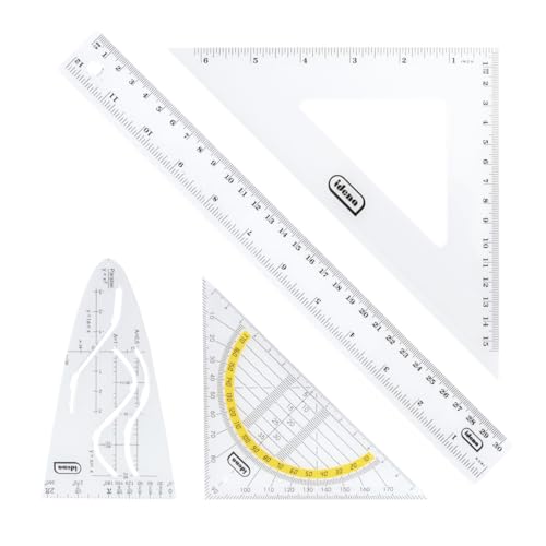 Das Geo-Set 602202 umfasst vier transparente Kunststoffwerkzeuge in einer praktischen 30 cm-Länge: Lineal, Geodreieck, gleichschenkliges Zeichendreieck (15 cm) und eine Parabelschablone. Die präzise Skala in Zentimetern und Millimetern ermöglicht das exakte Zeichnen gerader Linien sowie das Messen und Konstruieren verschiedenster Formen. Nutzen Sie das Set zum Zeichnen von Winkeln, Trapezen, Parallelogrammen und Dreiecken, zum Erstellen von Mustern oder zum Parabeln zeichnen – ideal für Mathematikunterricht, Ausbildung, Studium oder Freizeitaktivitäten. Die Transparenz erleichtert das Ablesen von Linien und Schnittpunkten, sodass präzise Ergebnisse erzielt werden können.
