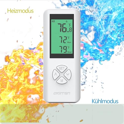 Der kabellose Thermostatausgang kombiniert Fernbedienung und Plug-in-Empfänger in einer kompakten Lösung, um Räume zuverlässig zu klimatisieren. Ausgestattet mit einem 2 m NTC-Temperatur-Sensor erkennt die Thermostat-Steckdose die aktuelle Raumtemperatur präzise und steuert Heiz- oder Kühlgeräte automatisch anhand der voreingestellten Zieltemperatur. Der WTC200 lässt sich flexibel in unterschiedlichen Räumen verwenden und speichert alle Einstellungen selbst bei Stromausfall. Das LCD-Display mit Hintergrundbeleuchtung bietet eine klare Ablesbarkeit, während die Fernbedienung eine Reichweite von bis zu 100 m in Freiflächen ermöglicht. Die Anlage unterstützt Heiz- und Kühlmodus, Hoch- und Niedrigtemperaturalarme und eine maximale Belastung von 14 A (bis zu 1500 W). Die Steckdose verfügt über eine An-/Aus-Taste und kann auch manuell betrieben werden. Mit der einfachen ℃/℉-Umschaltung lässt sich das System schnell an individuelle Vorlieben anpassen. Geeignet ist das System beispielsweise für Dachbodenventilatoren, Verdunstungskühler, Raumheizungen, Wandpaneelheizungen, Elektrokamine, Keller, Schlafzimmer, Fenster-Klimageräte, Garage oder Gewächshaus.