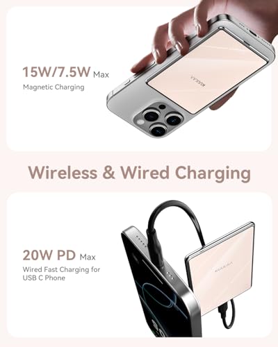 Kuulaa Magsafe Power Bank in Pink: Ultralchtes, kabelloses Ladeerlebnis mit magnetischer Befestigung. Die kompakte 5000 mAh Powerbank verbindet Mobilität mit praktischer Magnet-Technologie und USB-C Ausgang, kompatibel mit iPhone 16/15/14/13/12 Serien sowie Pro-, Pro Max-, Plus- und Mini-Modellen. Dank schlankem Design passt das Ladegerät bequem in Tasche oder Handyhülle, sodass Sie unterwegs zuverlässig Energie nachladen. Die magnetische Halterung sorgt für eine sichere Platzierung am Smartphone, während der USB-C Ausgang eine schnelle Stromversorgung ermöglicht. Ideal für Tage unterwegs, Reisen oder Notfälle – zuverlässig, flexibel und stilvoll in Pink.