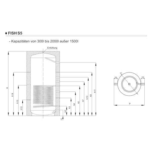 Der SUNEX Pufferspeicher FISH S5 mit 500 Litern Fassungsvermögen bietet eine hygienische, robuste Lösung für moderne Heizsysteme. Der stehende Speicher ist ideal kombinierbar mit Gas-, Öl-, Festbrennstoff- oder Elektro-Kesseln sowie Wärmepumpen und ermöglicht dank des integrierten Glattrohr-Wärmetauschers den direkten Anschluss einer Solaranlage. Durch die große Anschlussvielfalt lässt sich der Speicher flexibel in verschiedene Systeme integrieren und sogar mehrerer Speicher zu einer Batterieanlage verbinden, um die Gesamtkapazität bedarfsgerecht anzupassen. Gefertigt aus S235JR-Stahl mit automatischer Schweißung, arbeitet der Pufferspeicher bei einem Betriebsdruck von 3 bar und einer Betriebstemperatur von bis zu 95 °C. Die 50 mm starke PUR-Hartschaum-Isolierung mit PVC-Mantel minimiert Wärmeverluste und macht den Speicher solartauglich sowie wartungsfreundlich. Der großzügige Wärmetauscheranschluss (Rp 1”) ermöglicht eine zügige Integration in solarthermische Systeme. Entlüftung, Sensoranschlüsse und Wasserablauf erleichtern Inbetriebnahme und Wartung. Mit einem Durchmesser von 607 mm (mit Isolierung) und einer Höhe von 1306 mm lässt sich der Speicher platzsparend in nahezu jeden Heizraum integrieren; das Gewicht beträgt ca. 82 kg – ideal für Einfamilienhäuser und kleine Gewerbeobjekte.