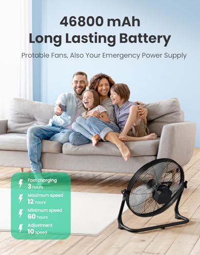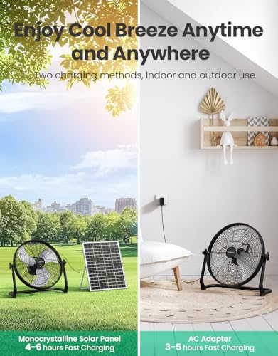 Tragbarer Solarventilator mit 46800 mAh, bis zu 12 Stunden Betriebszeit bei voller Leistung, 60+ Stunden im Minimum-Modus. 1500 U/min, 3850 CFM, 360° Neigung, 45 dB. IPX6-wasserdicht, vielseitig einsetzbar – Camping, Büro, Garten, Zelt, Ställe.