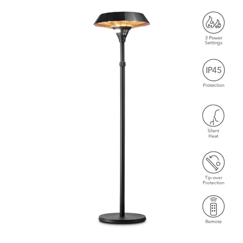 Design-Heizstrahler mit gleichmäßiger Rundumwärme für bis zu 15 m². Drei Stufen: 800/1.300/2.100 W. Robustes, schwarzes Gehäuse für langlebigen Einsatz.