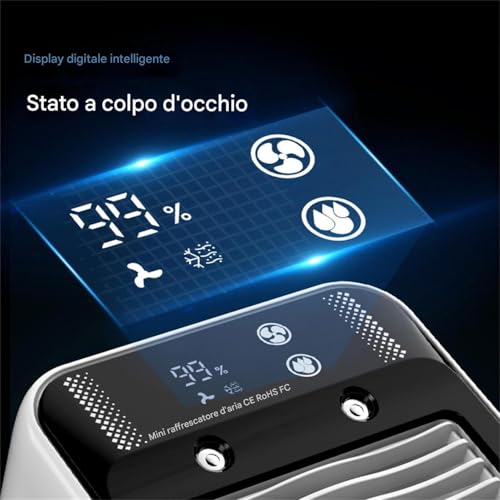 Kompakte, tragbare Kühlungslösung mit leisem Betrieb bis zu 8 Stunden, 500 ml Wassertank, schwenkbarem Zerstäuber und 360-Grad-Betrieb. Digitale Steuerung, LED-Display und integrierte Feuchtigkeitskühlung für angenehme Luftqualität.