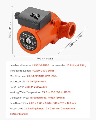 VEVOR LPS32- 8S/ 180 Zirkulationspumpe aus Gusseisen, 3/ 8 PS, 110 LPM, Warmwasserzirkulation, Gewindeanschluss, 3- stufige Geschwindigkeitseinstellung, leiser Betrieb, für Heizungsanlagen zu Hause
