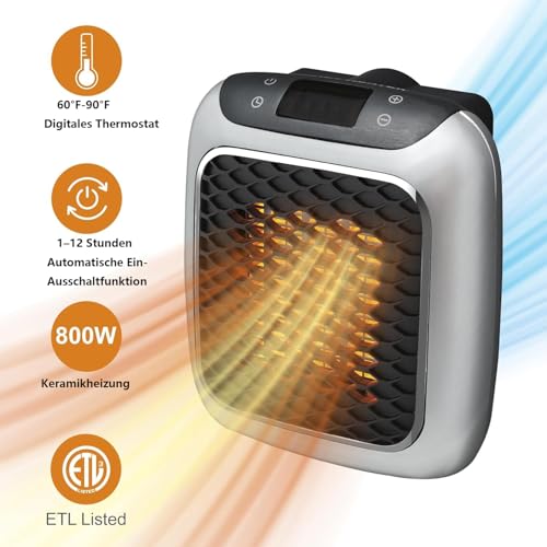 Kompakte Steckdosenheizung mit 800 W, Timer (1–12 h) und Fernbedienung. Schnelles Aufheizen, Temperaturbereich 15–32 °C, automatische Abschaltung bei 65 °C. Ideal für kleine Räume und mobiles Umfeld.
